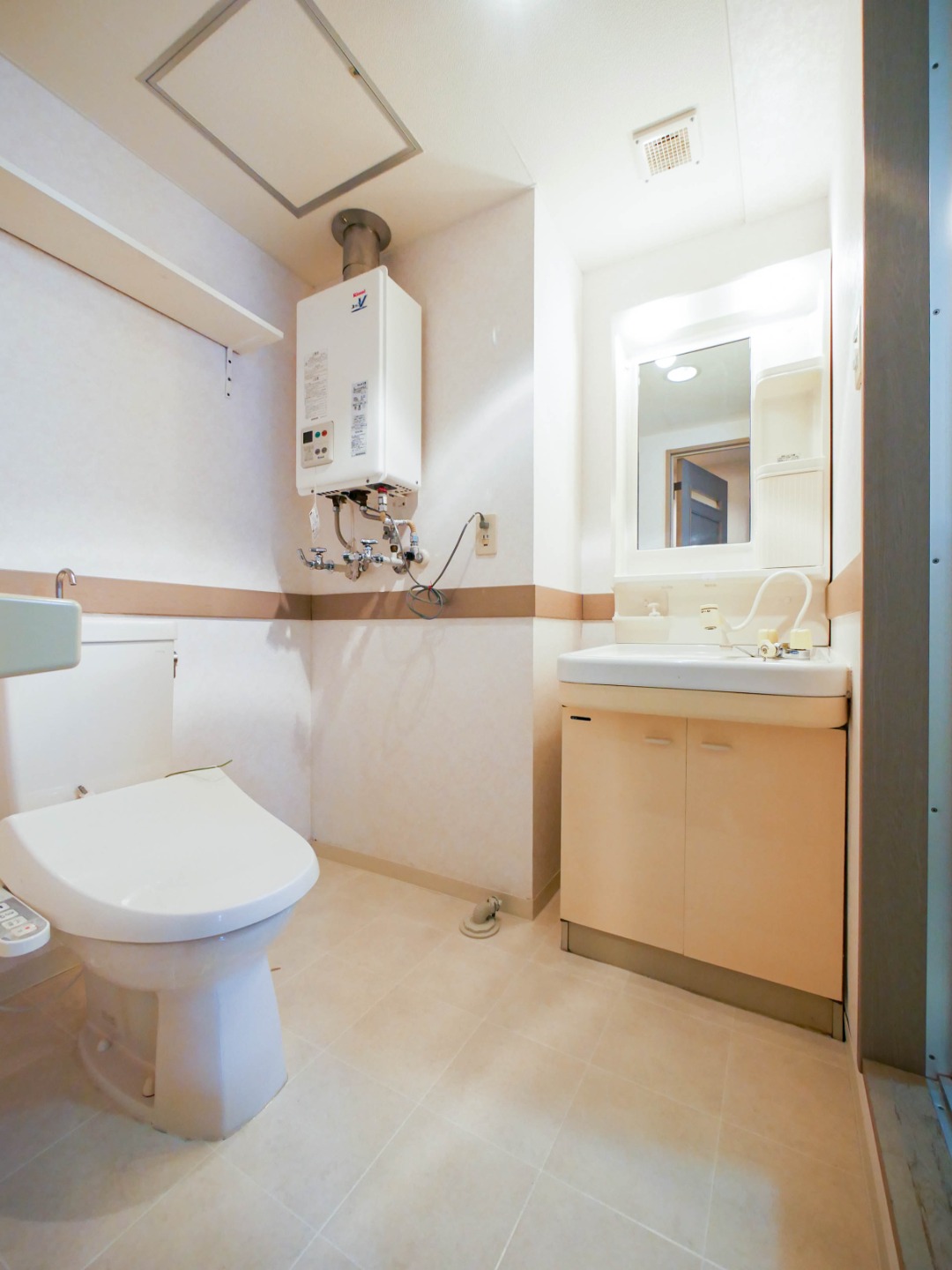 - 風呂(ユニットバス)、トイレ(水洗)、洗面台(独立)、シャワートイレ、洗髪洗面化粧台、バス・トイレ別、洗濯機置場(室内)