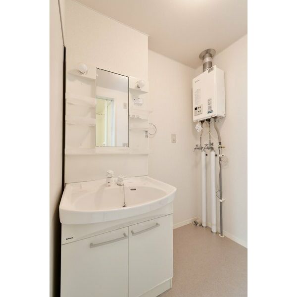 - 風呂(ユニットバス)、トイレ(水洗)、洗髪洗面化粧台、バス・トイレ別、洗濯機置場(室内)、洗面台(独立)