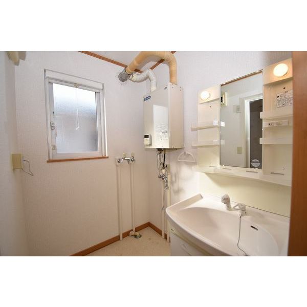 - 風呂(ユニットバス)、トイレ(水洗)、洗髪洗面化粧台、バス・トイレ別、洗濯機置場(室内)、洗面台(独立)